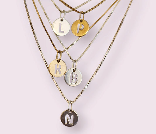 Choose a stamped disk, with one initial per disk - in uppercase Typerwriter font. All 925 Sterling Silver and 18ct Yellow Gold Plated onto Sterling Silver.